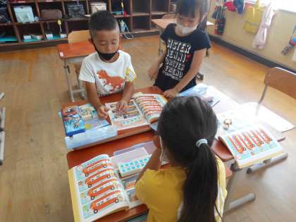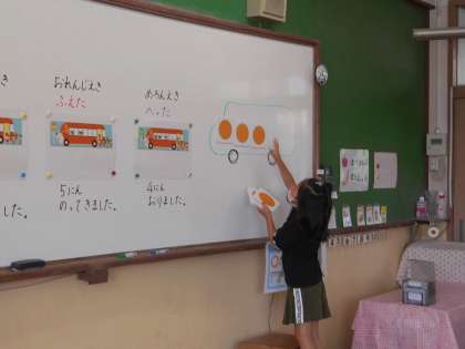 まず,一人で数図ブロックを動かしながら考えた後,二人組で発表しあいました。数図ブロックを動かしながら,「3人降りました。」「5人乗ってきました。」と話をし始めた子が現れると,それをまねするようにお話をしながら数図ブロックを動かし確かめる子がたくさん現れました。