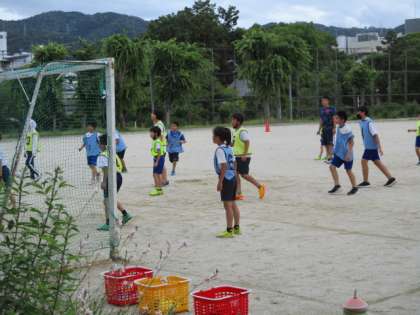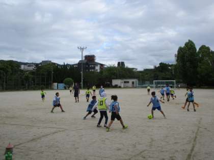 サッカー部の活動の様子です。3チームに分かれて,ゲームをしています。