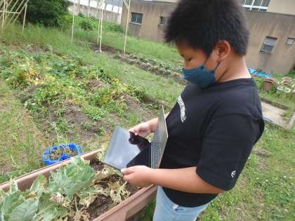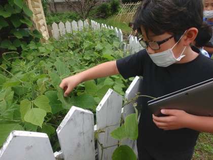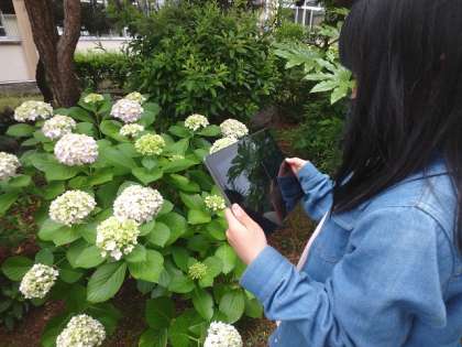 6月の絵を描きます。この日は,6月のイメージについて出し合いました。「雨」や「カタツムリ」など,6月といえば!という意見がたくさん出てきましたが,「普段見ているものの中にも,6月を感じるものはないかな?」と学校の中を探してみることにしました。探検の少し前に雨が降っていたこともあり,雨に濡れた植物の葉や湿った地面など,たくさんの6月を感じるものを見つけることができました。