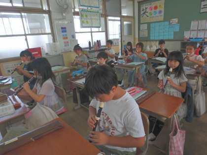 「ソ」の音を学習しました。「これまでに学習した「シ」や「ラ」の音よりも,そっと息を入れるんだよ!」と伝えると,息の入れ方に気を付け,きれいな音で演奏することができていました。
