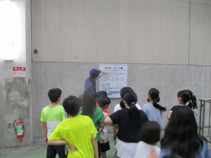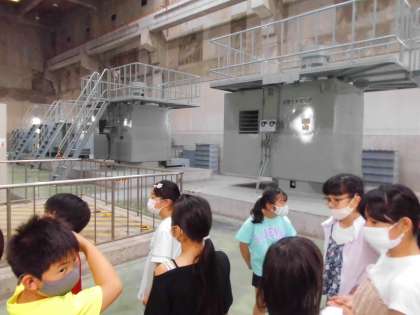 初めにポンプ場にある大きなポンプを見ました。水環境保全センターに流れてきた下水は,10mほど地下にためられています。そこから処理をするために,ポンプを使って上にあげます。そのポンプはとても大きく,何個もありました。