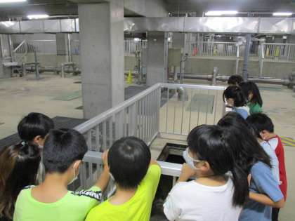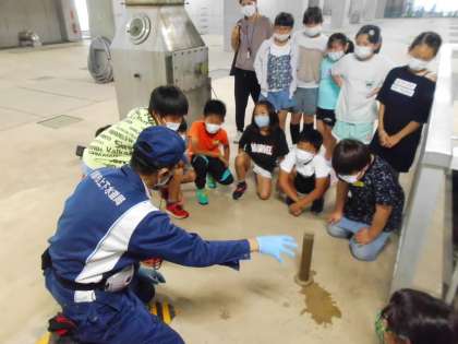 反応タンクでは,下水に微生物を混ぜて,空気を吹き込み,汚れを分解して泥として取り除きやすくします。200種類以上の微生物のおかげで水がきれいになっているそうです。
