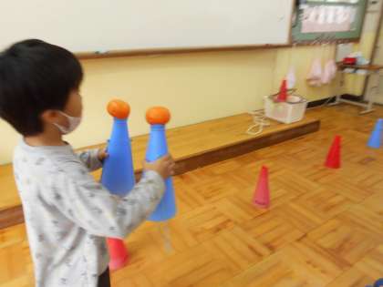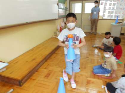ジャンプしたり,ジグザグ走りをしたりなど。いろいろな運動に取り組んだ後,前回やったボールリレーに取り組みました。
