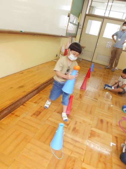 ボールをメガホンにのせて落とさないようにそうっと歩きます。