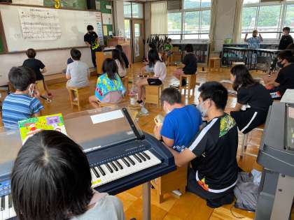 パートの重ね方を工夫して,全体の響きの変化を感じ取りながら「リボンのおどり」の演奏をしました。