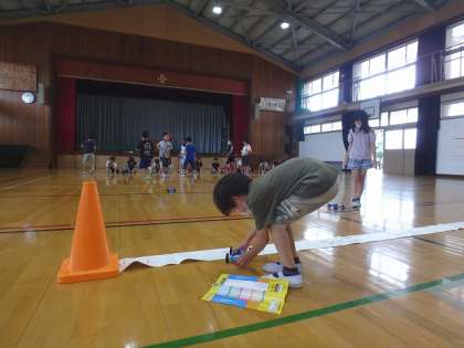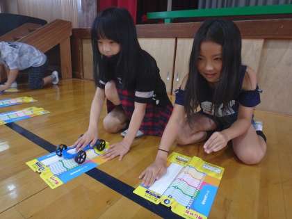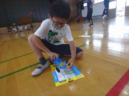 体育館に行って車を走らせます。「ゴール」と書かれたところちょうどに車を止めるには,どのようにすればよいのか。子どもたちは友達と話し合いながら活動を進めていました。
