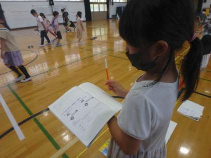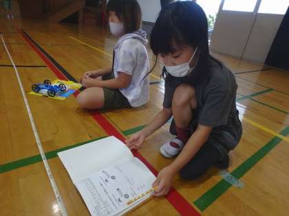 前回の学習で気付いたことから,「ゴムの伸ばし方を変えると,物の動き方はどのように変わるのだろう」という学習問題を立てました。教室で予想をした後,実際に体育館に行って,調べてみることに!この日は「10cm」「15cm」にゴムを伸ばした時に車が走った距離を調べました。結果から分かったことを進んで話し合うことができていました。
