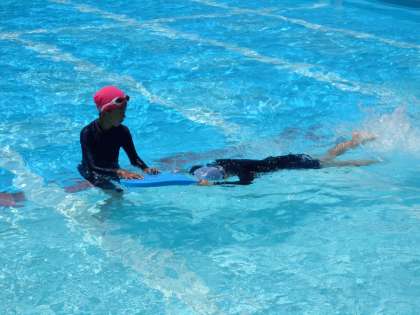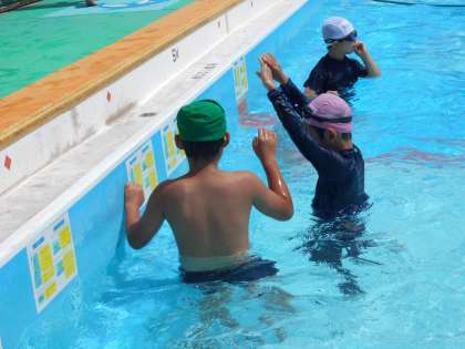 水泳学習では,バディ同士でアドバイスをし合いながら学習を進めています。けのび・バタ足などがとても上手になってきたので,次は「息継ぎ」をどうすれば上手にできるのか意識をしてやってみることになりました。