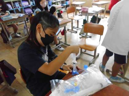 水を押すとどうなるか予想をたてて、実験をしました。空気と同じく、水も体積が小さくなるのではないかという予想が多かったですが,実際は水の体積はどれだけ強く押しても変わりませんでした。