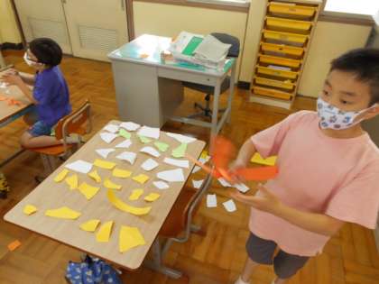 図工科の学習の様子です。画用紙をビリビリと破り、できあがった形から想像を広げて作品を作っていきます。