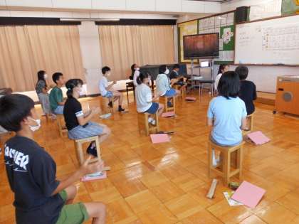 リズム伴奏に合う声をみんなで考え,楽しくリズムを取りながら,リズムの感覚を身につけていました。