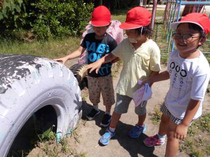 「先生、タイヤがめっちゃ熱い。」「プールが気持ちよさそう。」「ありがいっぱいいた。」と学校の夏をいくつも見つけていました。
