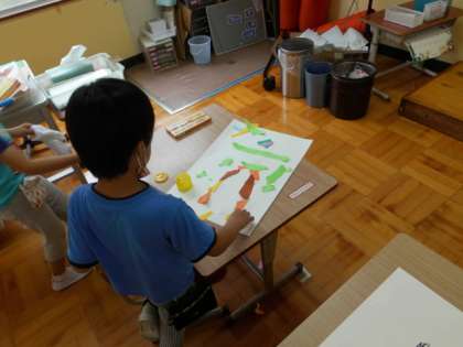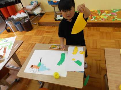 「やぶれたかたちからうまれたよ!」の学習の様子です。前回の学習を思い出して、付け足しをしたり、新しい作品を作ったりしました。