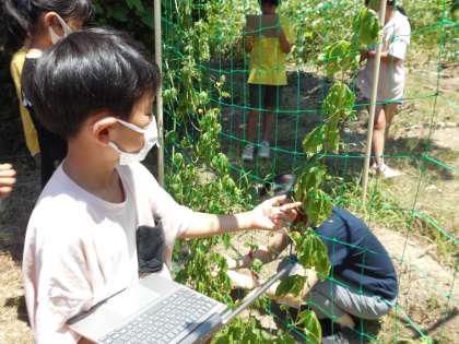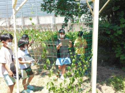 ツルレイシがぐんぐん伸びてきたので、観察をしに行きました。ツルがくるくるまいていたり、花の種類が2種類あったりといろんな発見ができました。