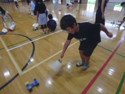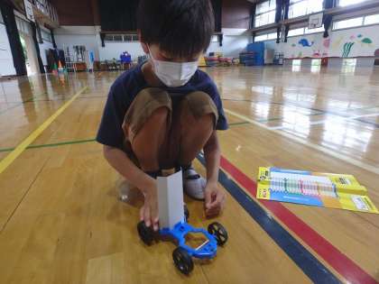 この日はうちわを使って,車を動かしました。「どうしたら車を速く走らせることができるのか?」とレースが始まりました。楽しんで取り組みながらも,気付いたことがたくさんあったようです。