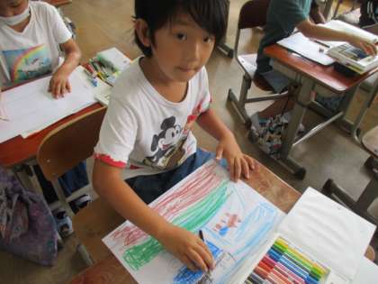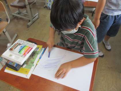 「あったらいいなこんなもの」の学習で、「あったらいいな」と思うものを絵に描いています。