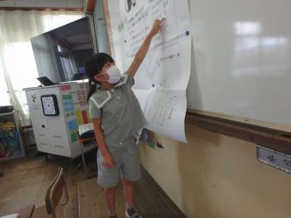 目盛りひとつが「1」ではない棒グラフの見方について学習をしました。子どもたちはたくさんの意見を出し合い,「記された数字の間がいくつに分かれているかで一目盛りの大きさが分かる」ということに気付くことができました。