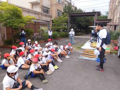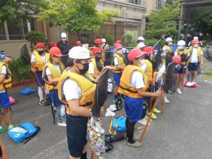 河川レンジャーの方にお世話になり、山科川の生き物や水質の調査を行いました。ライフジャケットを着て、網を持ち、山科川に向かいました。