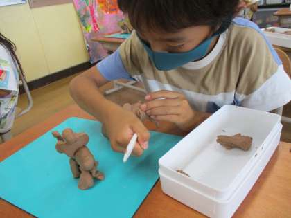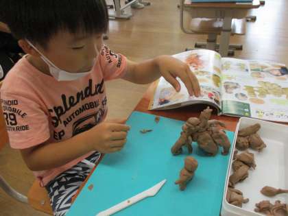 だれとどこにお散歩するかを考えて粘土で作りました。好きな動物や友だち、家族などを作っていました。