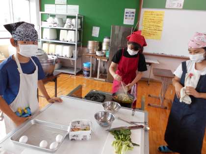 「めっちゃかさがへったで。」「卵がおいしそうになってきた。」などとみんなで喜びながら調理が進みました。