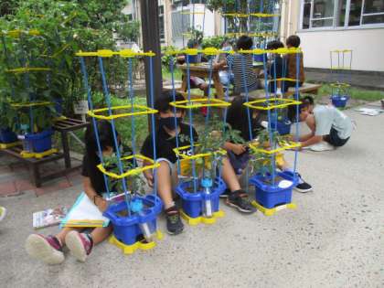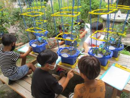 前回の観察では花がさいたことに注目して観察をしましたが、今回は実がついたことに注目をして、絵に描いたり、文に描いたりして表しました。