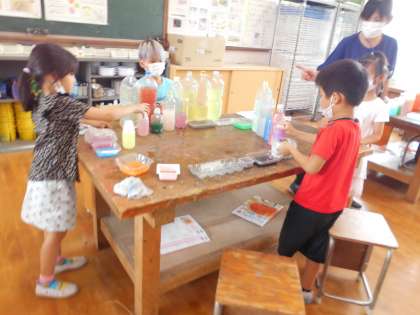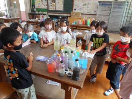 「見て、きれいな色になった。」「オレンジジュースみたい。」「濃い色から並べてみた。」と、色水づくりを楽しんでいました。