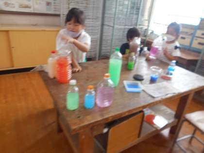 絵具を混ぜて、いろいろな色水を作って楽しみました。
