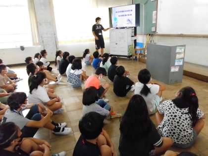 海の家にむけて、どんな場所なのか、どんなことをするのかなど、写真を見ながら話を聞きました。どの写真にも「わぁ!!」という歓声が!さらに楽しみになったようです♪