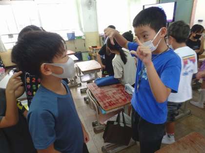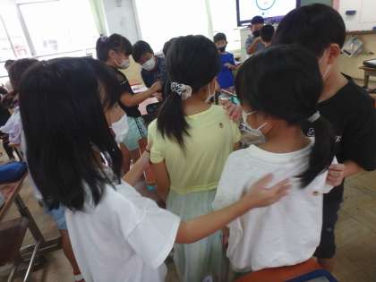 次は背中に貼られたシールの種類ごとに友達と集まるゲームです。ルールは「しゃべってはいけない」です。2回目には,コツをつかんですぐに同じシールの友達同士で集まることができていました。
