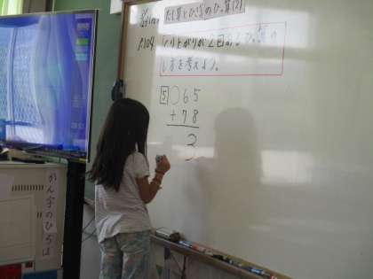 一の位にも十の位にも繰り上がりのある筆算の計算の仕方を考えました。