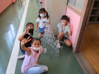 いろいろな材料を使って、「つむ」「ならべる」「たおす」「ころがす」などの遊びを楽しみました。