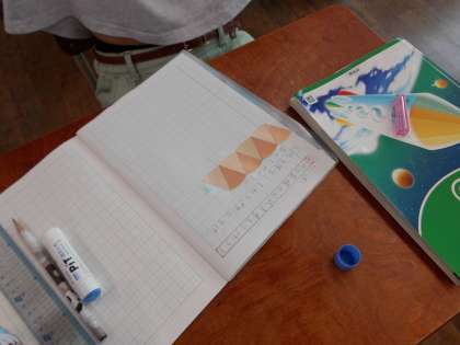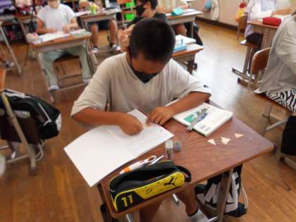 円を8等分・16等分したものを交互に敷き詰めていくとどんな形になるか実際にやってみると,「平行四辺形」に近づく。もっと小さく等分すると「長方形」に近づく。ということに気づいた子ども達は,じゃあこの長さは?と考えながら,みんなで円の公式を作ることが出来ました。