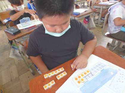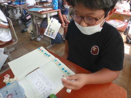 あまりのあるわり算の学習がスタートしました。この日は,1学期に学習したわり算の学習を思い出し,数図ブロックを動かしながら,わり算でも,あまりがあることを確かめた後,これまでと同じようにかけ算を使ってできないかと,かけ算を使った答えの求め方を考えました。