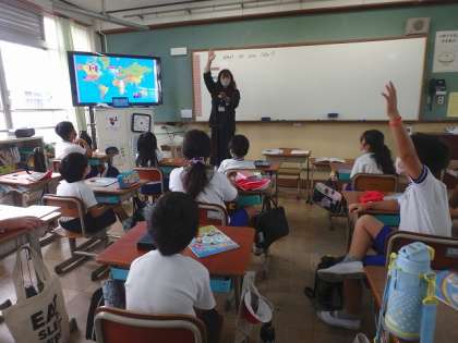 新しいALTの先生に自己紹介をしていただきました。子どもたちの質問攻め!すごかったです!