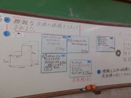 立体の体積の学習で,複雑な立体の体積をどのように求めたらいいのかをみんなで話し合いました。