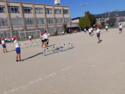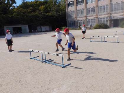 ハードル走では、頭の高さを変えずにハードルを越えるためには、ハードルの近くではなく遠くから跳ぶとよいということに気づいた子ども達。それぞれが意識をしながら走っていました。