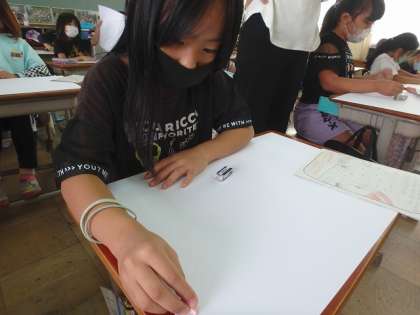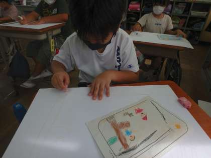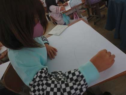 お話の絵の下描きをしました。アイデアスケッチを参考に,「自分が何を伝えたいのか」「お話からどのようなことを強く感じたのか」を大切にしながら描きました。