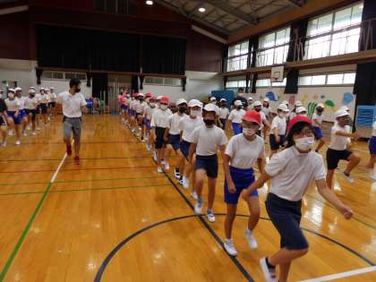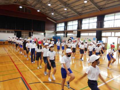 運動会に向けて、5,6年で合同体育を行いました。まずは、団体演技で披露する「集団行動」の練習をしました。心を一つに合わせて足並みをそろえることが大切です。リズムに合わせながら友達とも合わせる心地よさを感じながら表現できるように、しっかりと練習を重ねていきます。