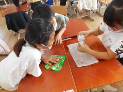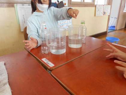 どちらの方法でも比べることができましたが、一人の子が「移し替える方法はこぼれることもあるからわかりにくいこともある。」と発表し、「なるほど」とみんなで共感していました。