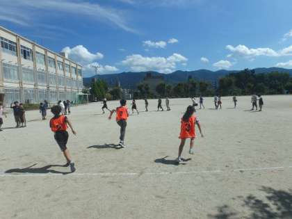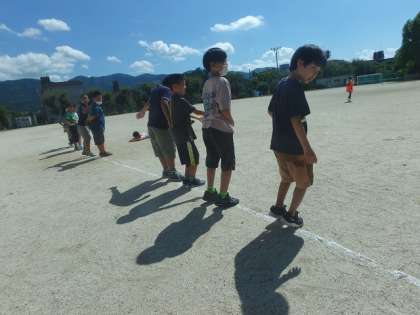 かげふみ遊びをしました。「必勝法や!」と,線ギリギリのところに並ぶ子どもたち。そこから,「かげの向き」や「太陽の位置」に注目しながら気付いたことを話し合いました。
