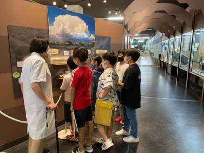 展示学習の間に、2回に分けて展示されている物について10分で解説をしてもらえるプログラムがありました。どのプログラムも楽しかったようで、集合するときにはとても満足そうに戻ってきていました。写真は「化石トンネル」と「ドローンラボ」の様子です。