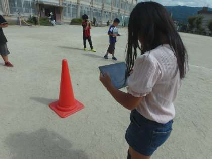 コーンにできた影がどのように動くのかを確かめました。同じ場所から写真を撮ると,1時間の間にも、影の向きが変わっていることに気付くことができました。