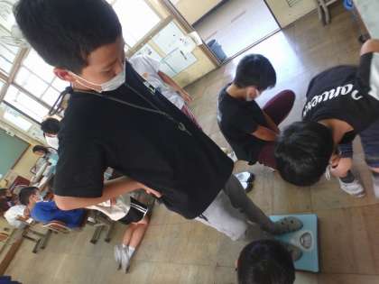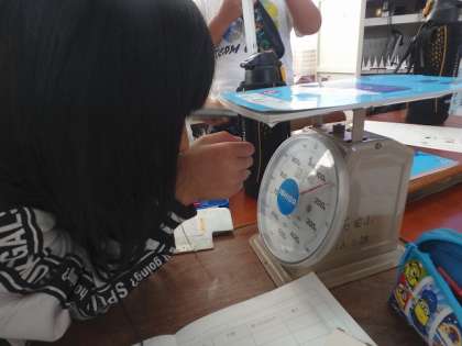 教室にある物の重さを,様々なはかりを使って量りました。体重計では人の体重を…鉛筆みたいな軽いものの時には…と,ものの重さによってはかりを使い分けることができていました。