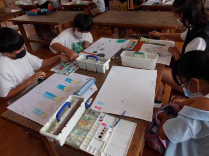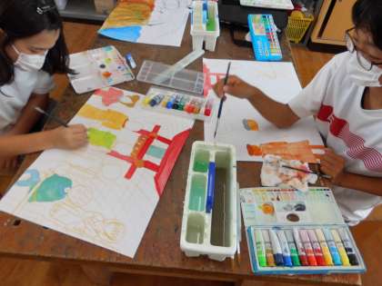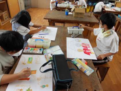 「車夫」というお話から広がった自分の世界を絵に表しています。