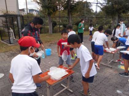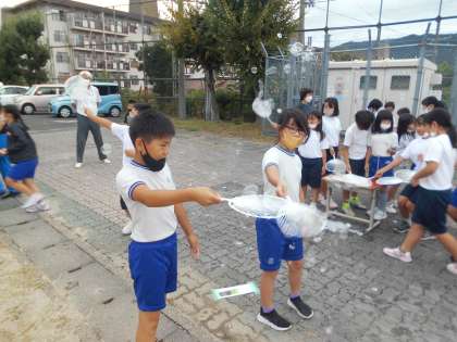 くすのき学級の友だちがシャボン玉屋さんを開いてくれました。うちわの骨組みを使って大小様々なシャボン玉を作っていました。みんな楽しそうにシャボン玉作りに取り組んでいました。くすのき学級のみなさん、ありがとうございました。