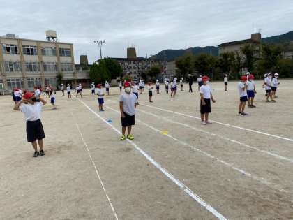 運動場での練習です!自分の踊る位置や隊形の移動を確かめました。