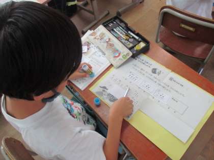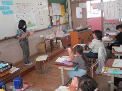 和太鼓のドン・ドコ、ドンのリズムを使って、くり返しのあるリズム作りをしました。