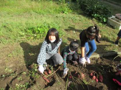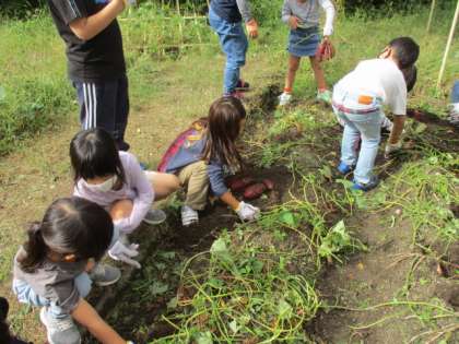 学校園のサツマイモをみんなで収穫しました。