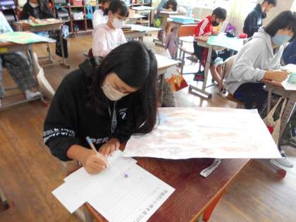 自分の作品の工夫した所をカードに書いてから友達の作品を見て回り,いいなと思うところを交流しました。