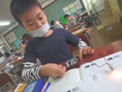 豆電球に電気がつくと,「おぉ〜!」と言いながら嬉しそうにしている子どもたちがかわいかったです!